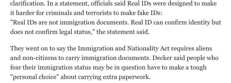 国土安全部的官员澄清说,“Real ID不是移民文件。它可以确认身份,但不能确认其合法身份。《移民与国籍法》要求外国人和非公民携带移民证件。”