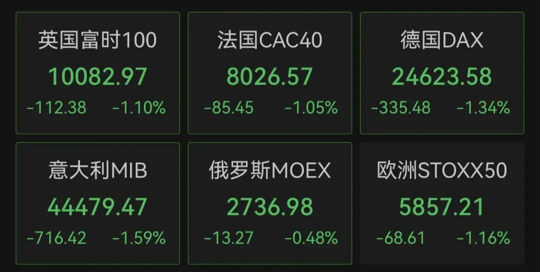 值得一提的是,欧洲主要股指亦大跌。截至发稿,英国富时100指数、法国CAC40指数、德国DAX指数、意大利MIB指数均跌超1%。