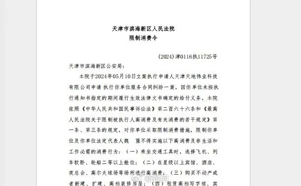 2024年10月29日,滨海新区法院针对滨海新区公安局作出《天津滨海新区人民法院限制消费令》。
