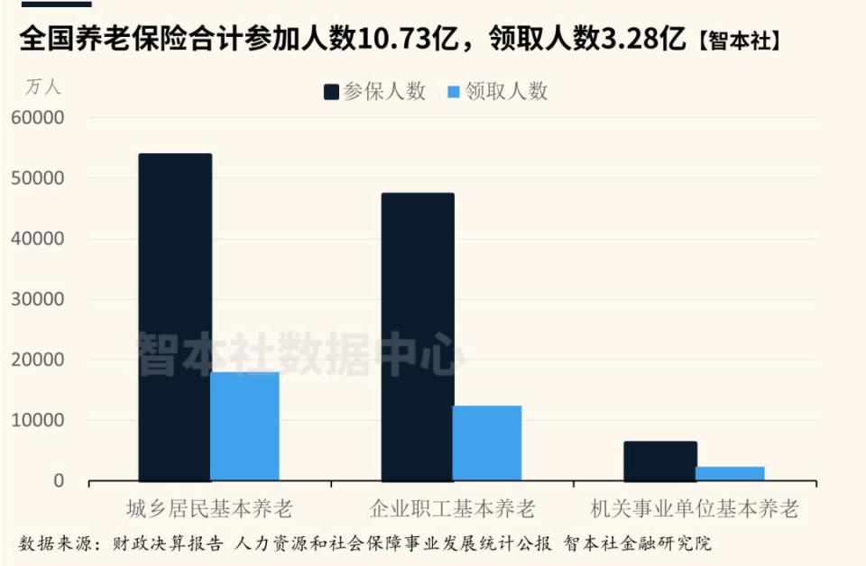 根据智本社数据中心的统计,截至2024年底,全国基本养老保险参保人数为10.73亿人(新增639万人)。其中: