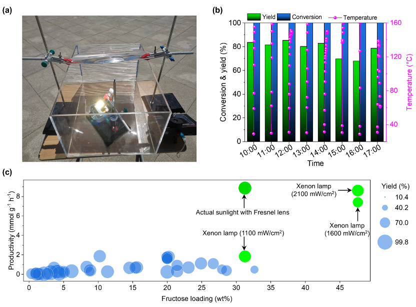 在室外利用透镜聚集太阳光,仅10分钟反应时间,HMF产率可以达到85.2%。即便在接近饱和的果糖浓度下,光热体系仍然能够在10分钟将果糖完全转化,单位质量催化体系的HMF生成速率相比于论文报道的最高值提升4倍以上,转化频率提升1-3个数量级。