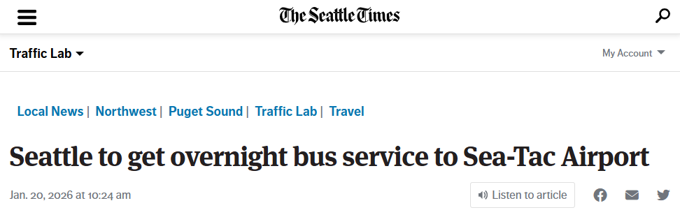 海湾公共交通局(Sound Transit)将于今年三月开通一条连接西雅图-塔科马国际机场与市中心的夜间公交车线路,运营时间为每日零点至凌晨四点。