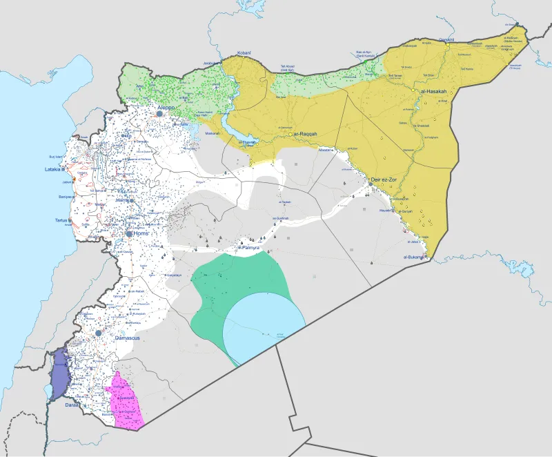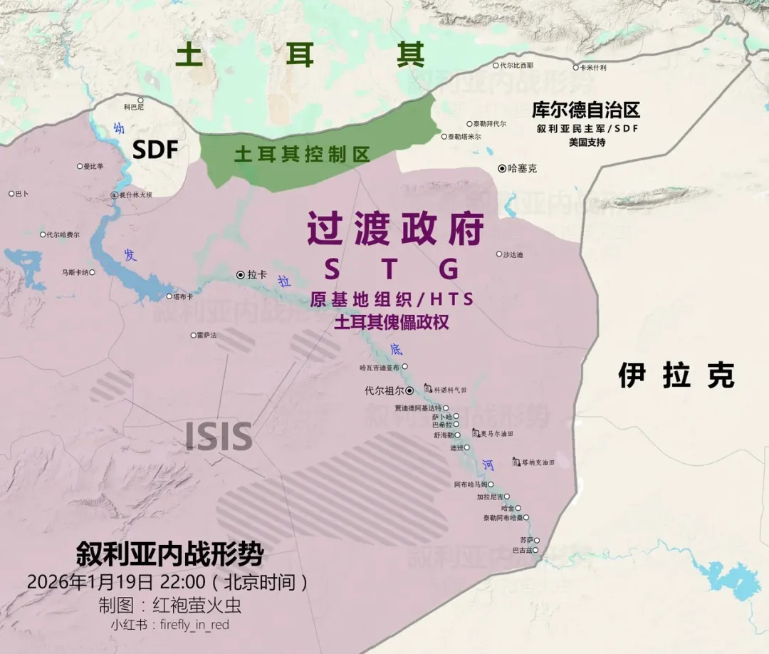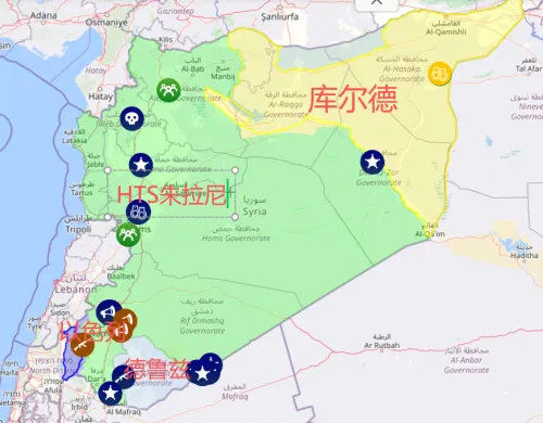 但叙利亚内部还有多个武装割据势力,可以看上图,白色是朱拉尼的新叙利亚军;黄色是沿着幼发拉底河武装割据的叙利亚民主力量(后面简称库尔德武装);最上方浅绿色是土耳其扶持的叙利亚国民军,目前已经合并到新叙利亚军里;右侧蓝色圆圈是美国占领的安全区,旁边深绿色是美国扶持的叙利亚自由军,目前同样合并到新叙利亚军中。
