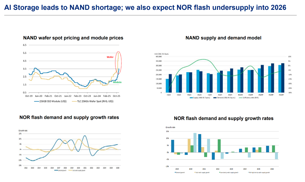 SK海力士和三星被列为首选,其上涨潜力分别达到13%和14%。这一判断基于两者在HBM市场的主导地位以及整体商品周期的改善。与此同时,NAND市场也迎来了由AI推理需求支撑的“超级周期”。闪迪公司和KIOXIA因其在企业级SSD领域的潜力而被看好。分析显示,AI存储需求导致NAND出现短缺,甚至NOR Flash的供应不足也可能持续至2026年。