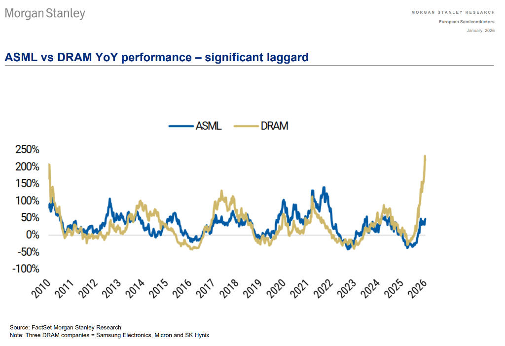 除了直接的存储芯片制造商,半导体设备(SPE)厂商同样是这场盛宴的受益者。阿斯麦(ASML)因EUV层数的增加而受益,目标价看涨至1400欧元,上涨空间达25%。日本设备商如Advantest和DISCO,由于其产品在HBM制造过程中不可或缺,也被视为高增长标的。