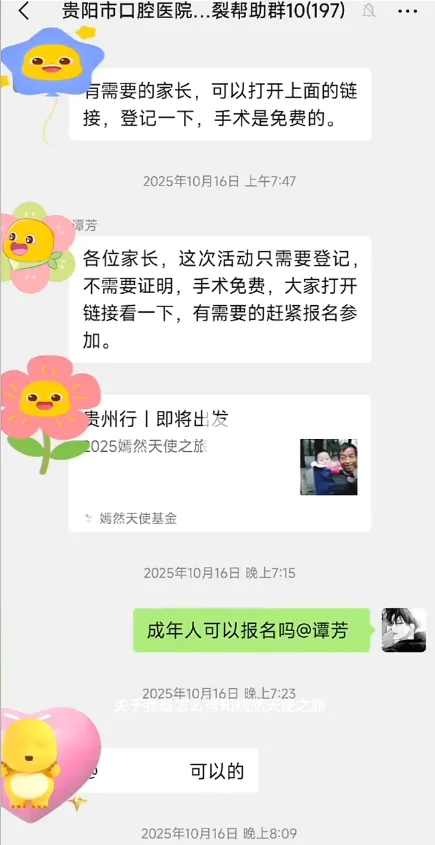 自己是在“嫣然天使之旅贵州行”公益活动中报名的,起初并不敢相信是真的,抱着试试看的心情填写了信息。