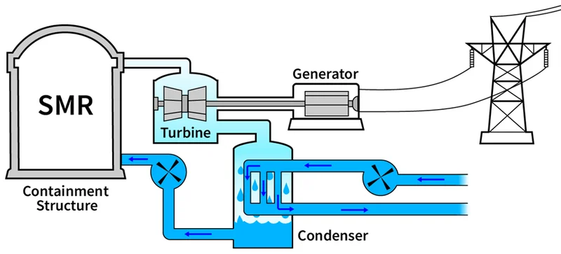 SMRs产生的热量可用于烧开水、产生蒸汽、驱动涡轮机和发电机,从而在火力发电厂中发电