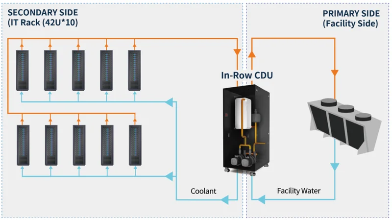 液冷CDU,核心作用是安全、精准、高效地将冷却液输送到服务器芯片,并回收热量