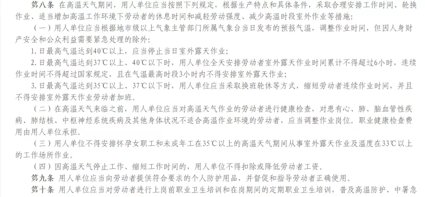 ◉防暑降温措施管理办法》第八条规定:日最高气温达到40℃以上,应当停止当日室外露天作业