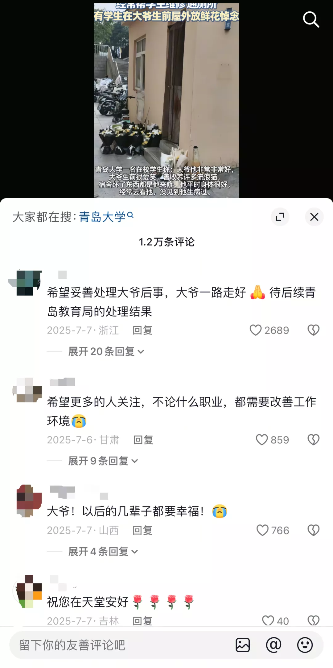 ◉山东青岛大学一宿管大爷被发现在值班室昏迷,送医后抢救无效去世