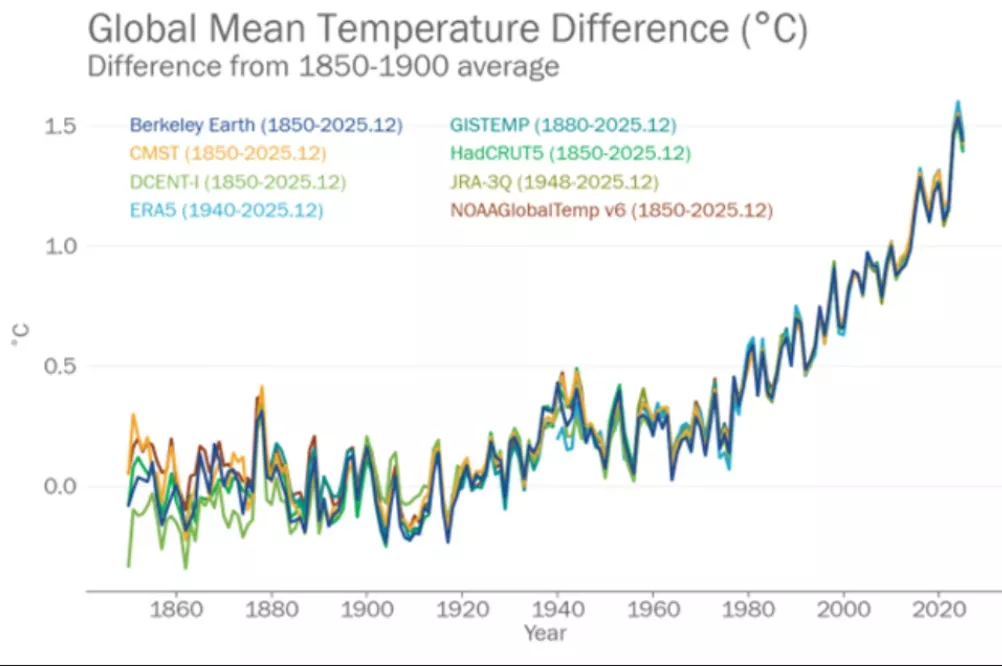 ◉八个数据集显示1850年至2025年相对于1850年至1900年平均水平的年度全球平均气温异常情况。如图所示,2025年全球平均表面温度比1850至1900年、即工业化前的平均值高出1.44摄氏度