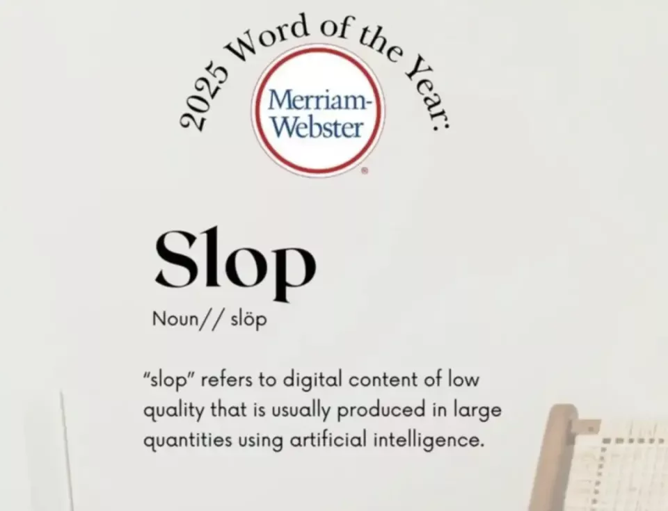 就在前几天,“Slop”被《韦氏词典》列入2025年度热词,被定义为“通常由人工智能(AI)批量生成的低质量数字内容”。据专家溯源,“Slop”在18世纪时意为“软泥”,19世纪时指代“食物残渣”,后引申为“垃圾”“几乎没有价值的产品”,中文则译为“泔水”“脏水”。