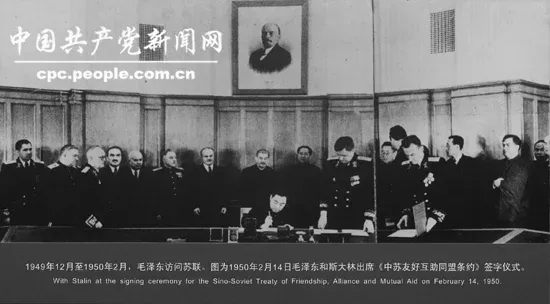 1949年10月3日,中苏建立大使级外交关系。1949年12月,毛泽东首次出访苏联,为新中国外交打开了局面。1950年2月14日,毛泽东同斯大林出席了《中苏友好互助同盟条约》的签字仪式。