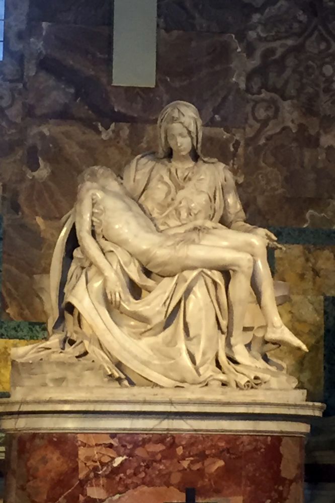 米开朗基罗的《圣殇》Pietà静静安置在教堂一隅。大理石展示出圣母颌首闭目,神情克制的形象。肌理的柔软,衣褶的层次被刻画得极具质感,完美到近乎神性。很难想象这件作品竟然出自一个23岁的年轻人之手。伫立其前,不免联想到在印度所见的犍陀罗凋塑,同样植根希腊、罗马艺术,古典风韵跨越时空彼此呼应。