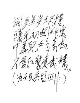 “这次同行的有一位女机要员。毛在一九六一年跟这位机要员很热火,二月时毛在她的民兵服相片背面写了一首七绝:为女民兵题照:“飒爽英姿五尺枪,曙光初照演兵场。中华儿女多奇志,不爱红装爱武装。”她当时就想拿出去发表,被毛阻止了。