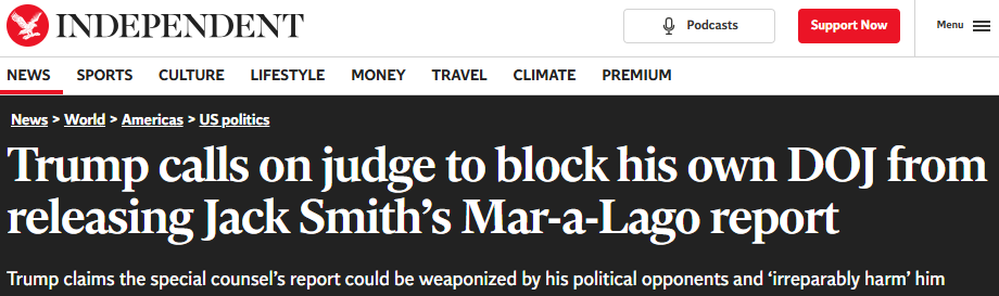 总统川普要求一名联邦法官阻止司法部公布杰克·史密斯(Jack Smith)就川普被指在海湖庄园藏匿政府文件和机密材料一事所撰写的报告。