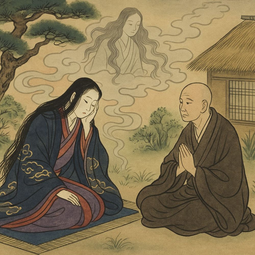 回到自己室中,照例在佛前诵经。直到夜半,就靠在白昼的坐垫上睡觉了。次日,写信给明石夫人,内有诗云:“虚空世界难常住,携泪泣归夜半寒。”