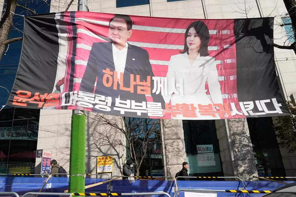 当地时间2026年1月28日,首尔中央地方法院外悬挂着一幅印有尹锡悦及其夫人金建希照片的横幅。图/视觉中国