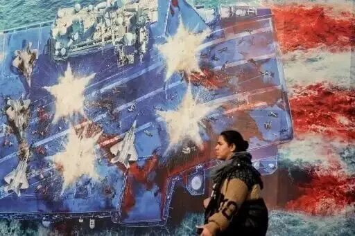 伊朗首都德黑兰市中心一处广告牌,展示了一艘航母被摧毁的图片,画布一角写着一句标语:“种风者必收旋风。(也译作恶有恶报。If you sow the wind,you will reap the whirlwind.)”