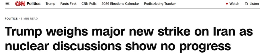 CNN1月28日最新报道,在华盛顿和德黑兰就限制伊朗核计划和弹道导弹生产进行的初步讨论未能取得进展后,美国总统川普正在考虑对伊朗发动新的重大打击。