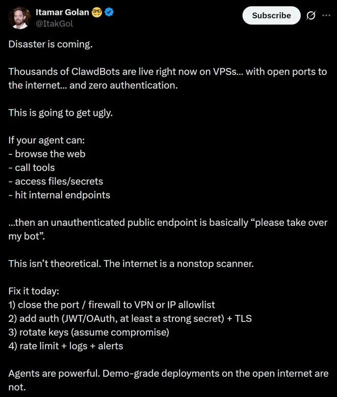 此刻,成千上万的ClawdBots正运行在VPS上,它们的端口直接暴露在公网上,而且没有任何身份验证。
