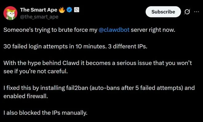 还有用户发现,有人正在尝试对自己的ClawdBot服务器进行暴力破解。