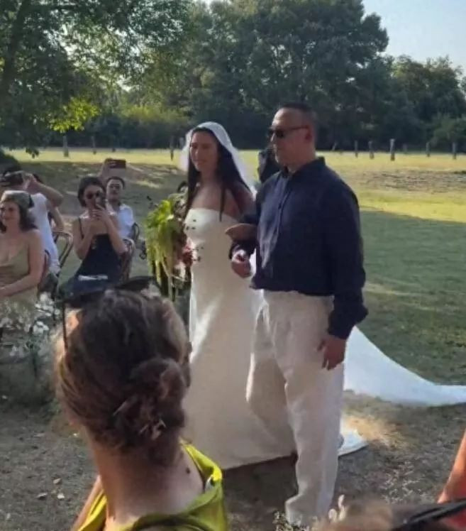 2025年8月8日的婚礼成了这个特殊家庭关系的试金石。 婚礼地点选在巴黎近郊庄园,只邀请三十余位亲友。 姜一郎穿着简约白纱,小腹微隆引发怀孕猜测。 新郎是29岁的英美双籍摄影师Franklin Clark Magnuson,仪式上激动落泪。 桑德琳身着黑色挂脖长裙,先牵女儿走了一段,然后郑重将她交到姜文手中。 姜文戴着墨镜,穿蓝色衬衫配白裤子,挽女儿走向新郎时突然摘掉墨镜,喉结微动,那个银幕硬汉露出了罕见的柔软。