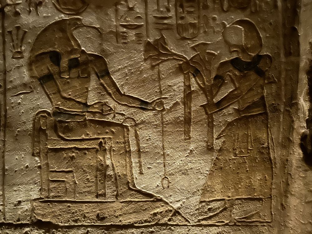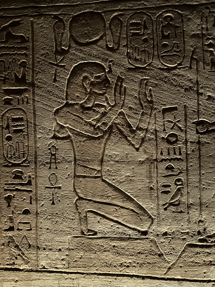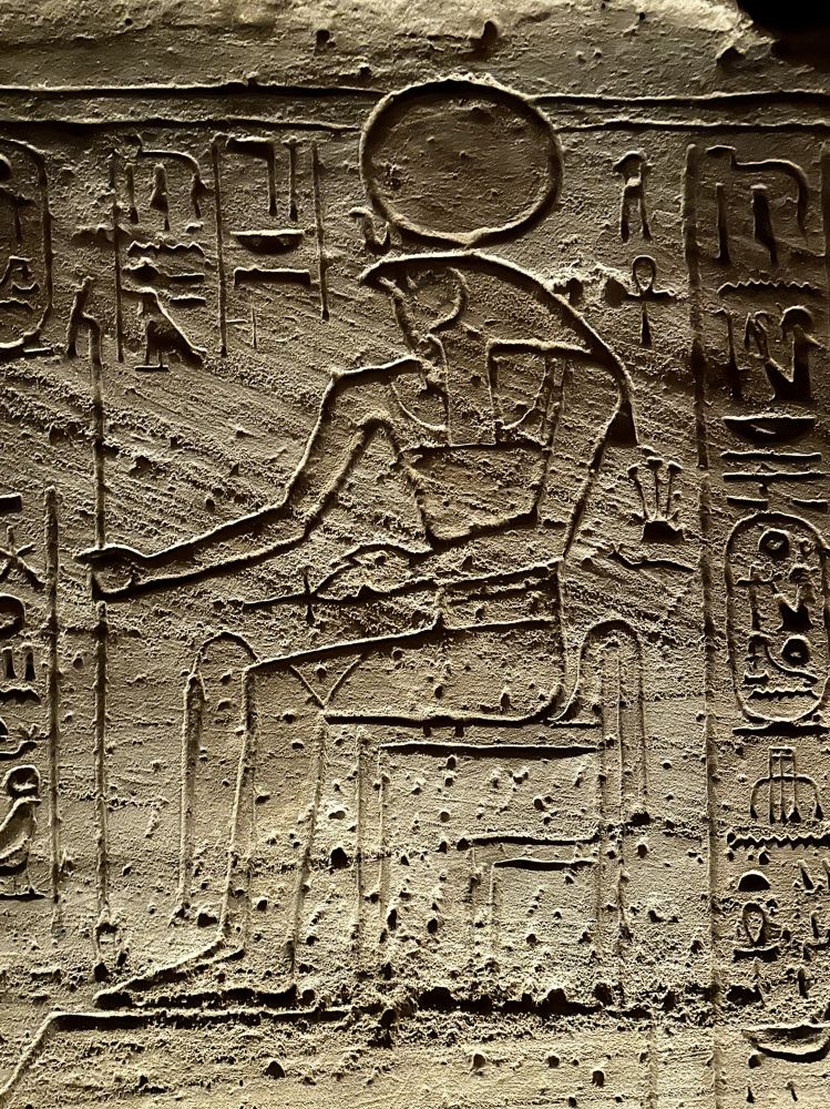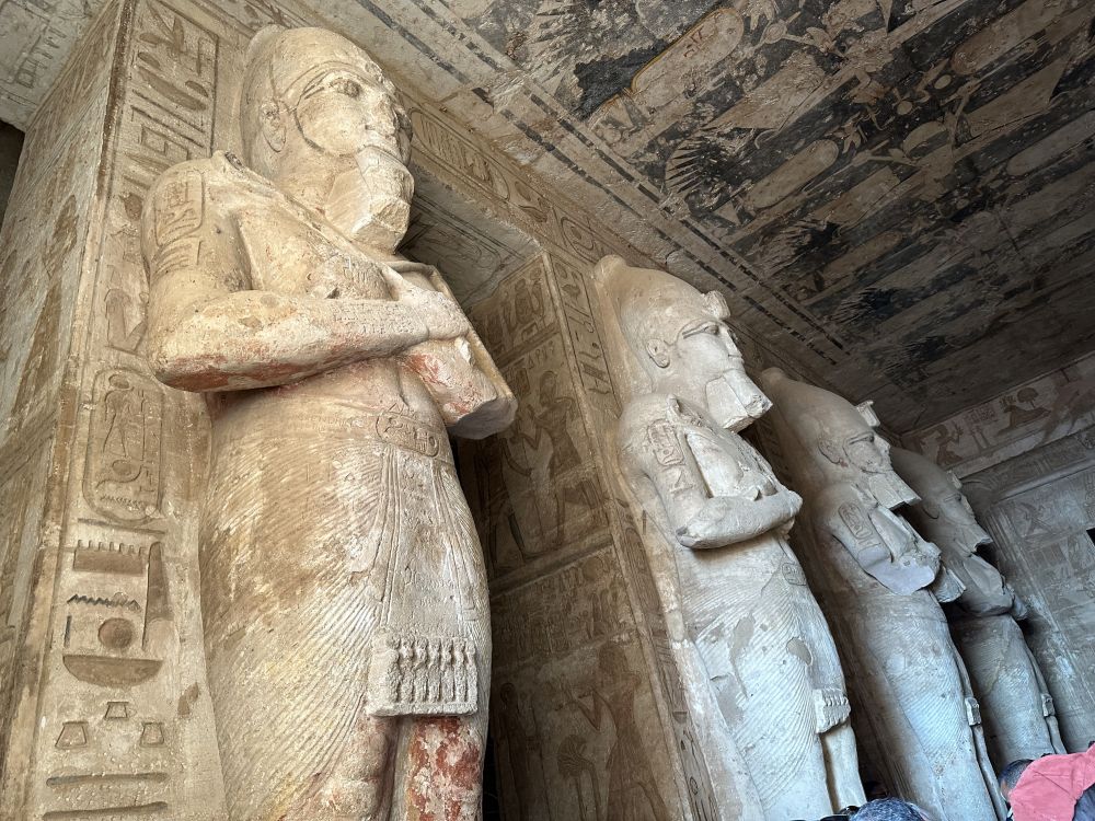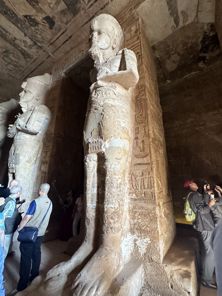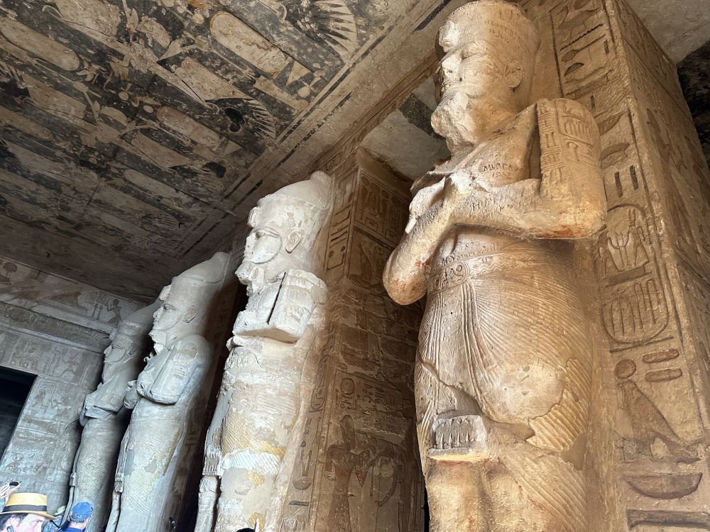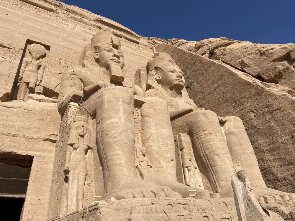 大庙正面凿刻着四尊高约20米的拉美西斯二世巨型坐像,端坐于岩壁之前,气势恢宏,象征着法老至高无上的王权与神性。