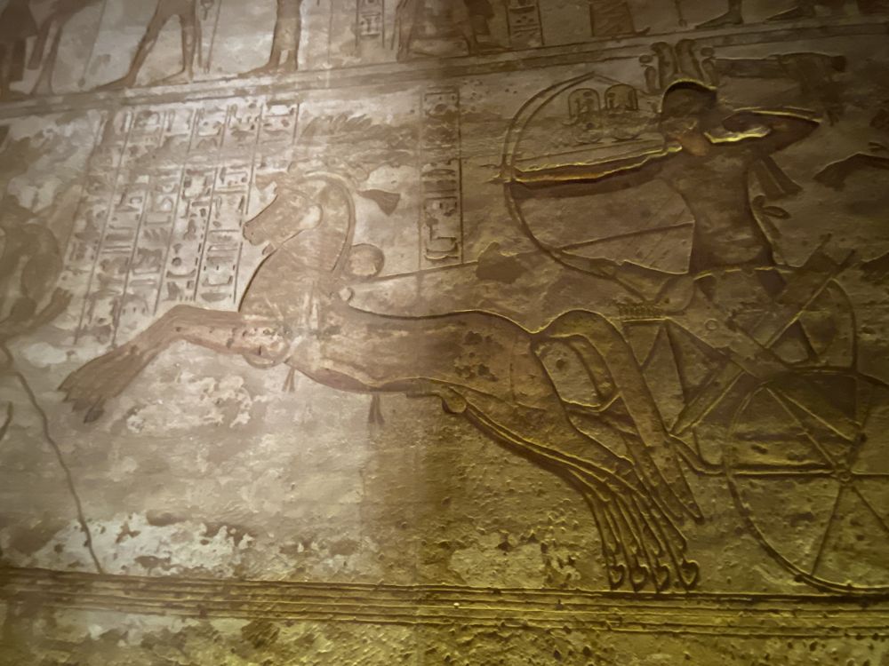 神庙内部采用长轴式布局,沿轴线层层展开,壁面浮雕生动记录了拉美西斯二世的军事胜利,尤以著名的卡迭石战役最为引人注目。