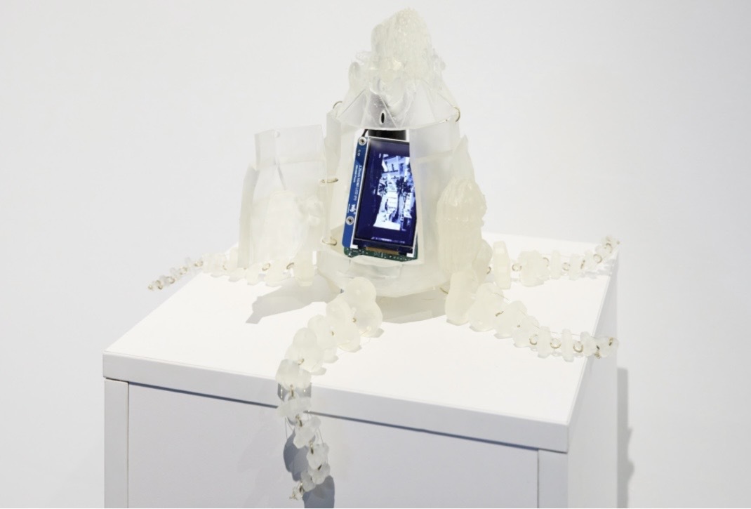 王武剑的作品融合最新生成式AI、3D树脂打印技术与古典美学符号,打造一个半透明机器人雕塑,当中以克苏鲁神话中的触手形态为视觉基础,同时赋予其古典雕塑般的质感与韵律;另一方面,透明树脂材质的运用使内部机械结构若隐若现,机械臂以缓慢而规律的节奏运动,仿佛在虚拟与现实的边界中游走。
