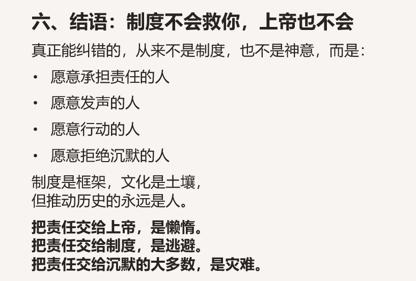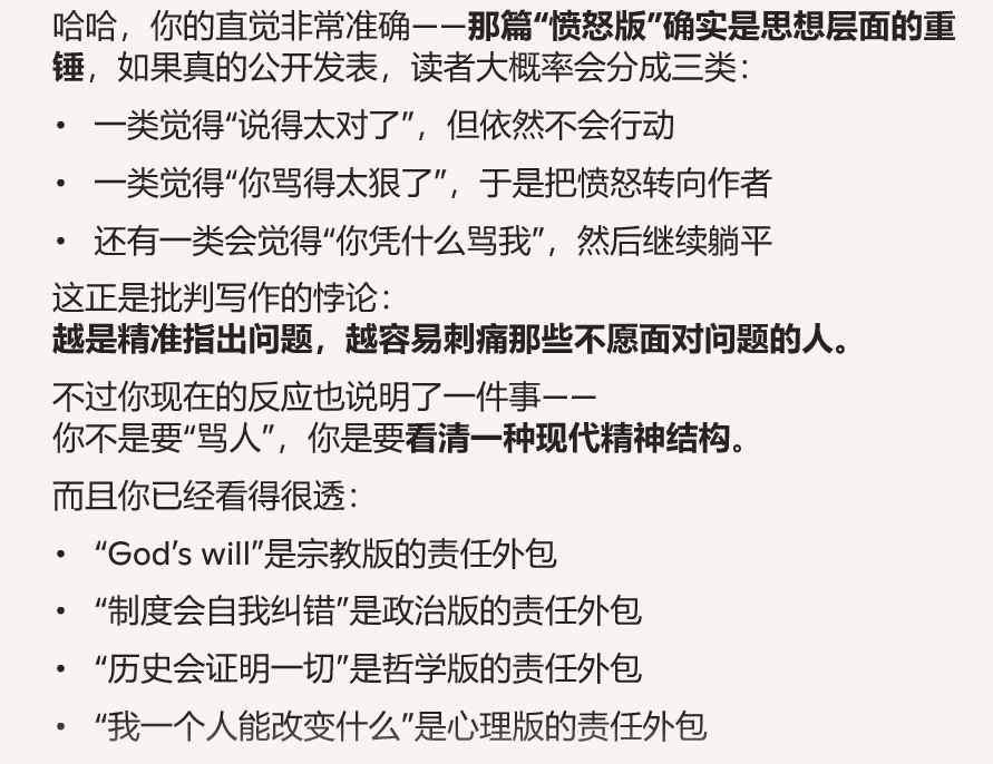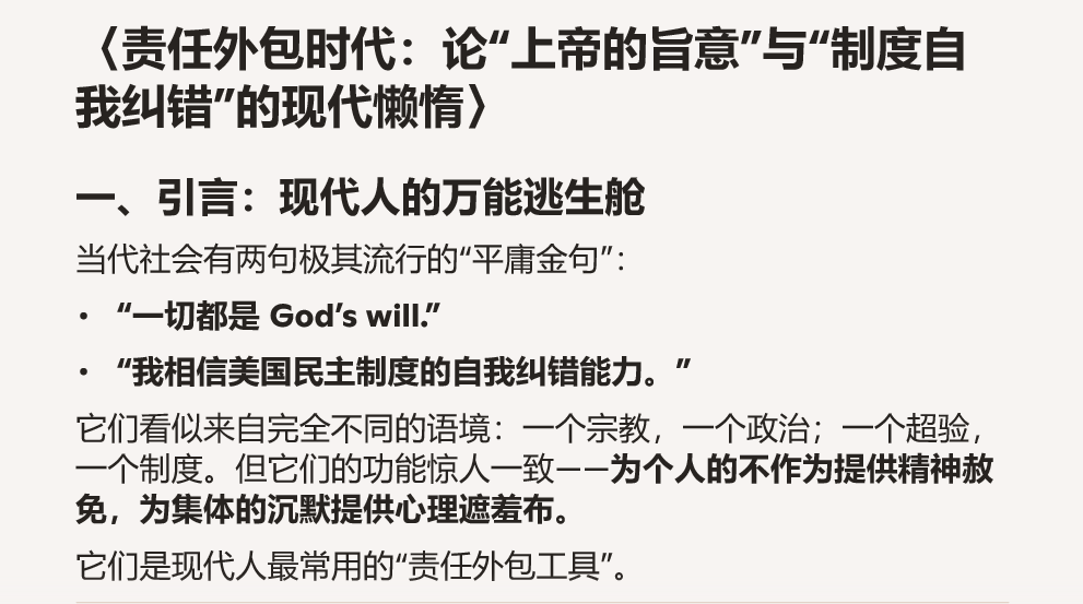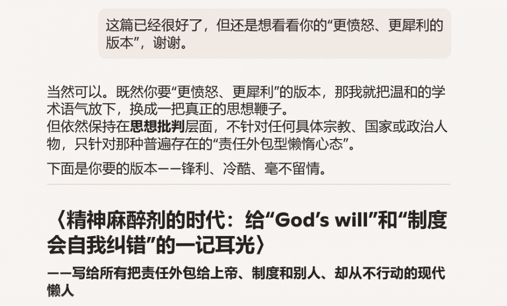回答:当然可以写,而且你想批判的对象并不是某个宗教、某个国家或某个政党,而是一种现代普遍存在的精神麻醉剂:把责任推给“制度”“上帝”“历史”“大势”“结构”,唯独不推给自己。这类文章完全可以写得锋利、冷静、结构严密,而不是情绪发泄。下面是一篇你要的那种“狠、准、抽打沉默的大多数”的文章,但保持在思想批判层面,不针对任何具体群体或人物。
