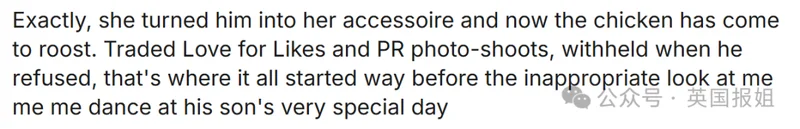 “她把儿子当成了自己的装饰品,如今恶果终将自食。用爱换取点赞和公关照,当他拒绝时便断绝关系——这一切早在儿子人生重要时刻那场自我炫耀的舞步之前就已埋下伏笔。”
