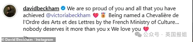 与此同时,小贝转发了妻子的帖子,动情回应称“我们都为你感到骄傲,没有人比你更配得上这项荣誉。”
