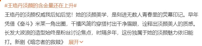 一则,王珞丹淡颜的含金量还在上升的热搜霸屏,才后知后觉,好像,每次盘点内娱的美女,从未带上过王珞丹。