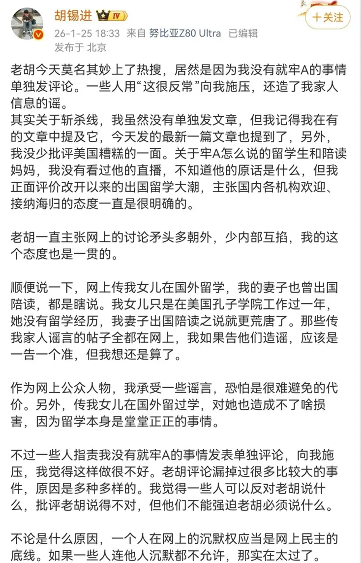 1月25日,胡锡进罕见发长文为自己说话,说自己因为“斩杀线”的问题,备受困扰。