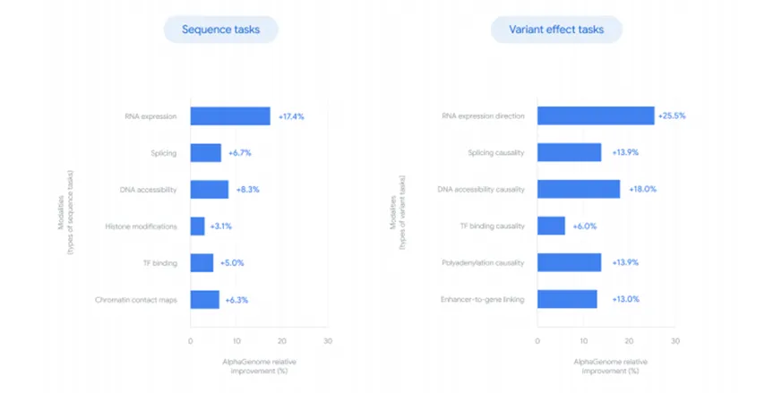 图2:相比现有最好工具,AlphaGenome在基于DNA序列预测DNA分子哪些部分将彼此靠近、遗传变异是会增加还是减少基因表达,或者是否会改变基因剪接模式上的准确性提升。