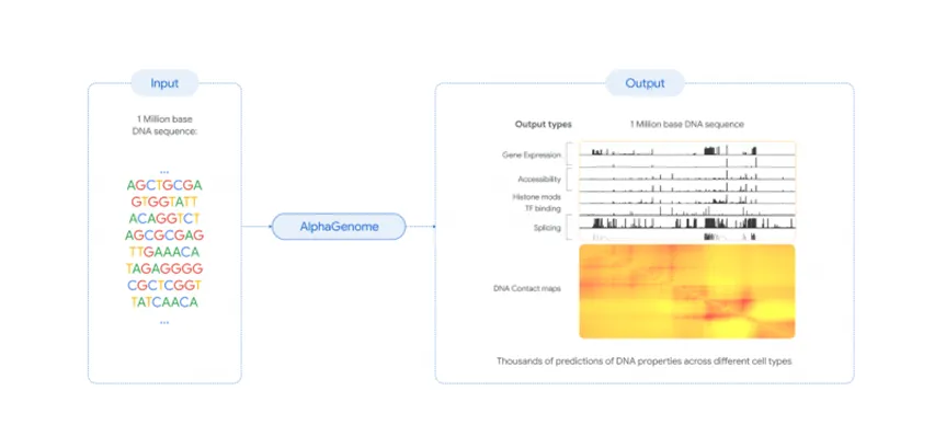 AlphaGenome以一个1M长度的DNA碱基序列作为输入,一次性预测数千个由该段序列调控活性的分子特征,例如不同组织的基因表达量,RNA剪接位点,染色质状态,染色质构象等。它还可以通过比较突变序列与未突变序列的预测结果,来评估遗传变异或突变的影响。