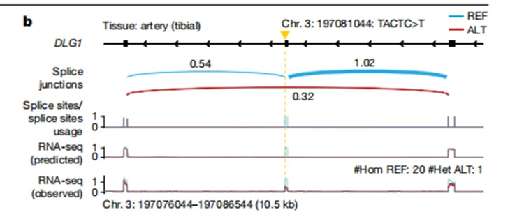 根据这一最新研究,AlphaGenome能根据变异位点,准确预测受影响的外显子剪接位点使用率降低、跳过外显子的连接点丢失,以及外显子旁路的新连接点出现,同时预测该外显子的RNA-seq覆盖度显著下降。这意味着能够扩大遗传变异的解读范围,尽管AlphaGenome还不能直接应用于医学诊断。但当医生发现一个患者有某个基因变异,但不确定它是否致病时,AlphaGenome可以提供"辅助证据":如果预测显示这个变异会严重影响剪接或表达调控,那么它致病的可能性就大大增加,从而帮助医生做出更准确的诊断。