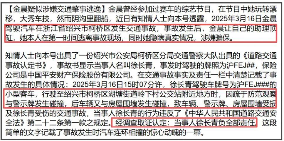 ——“从常理看,若金晨当时正常驾驶、手续齐全,且事故不大根本无需逃逸。公众质疑背后是否有隐情,是惧怕责任还是涉嫌酒驾或者毒驾?肇事逃逸让人顶包触碰法律红线,这种以身犯险的行为很难用一时糊涂来解释。”