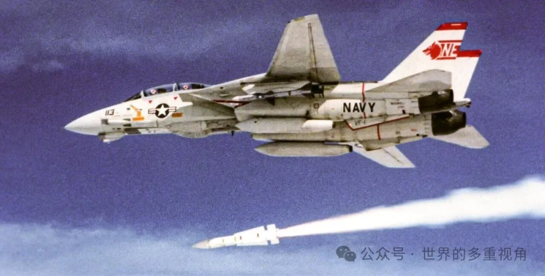 第2舰载机联队(CVW-2)当时有VF-1和VF-2两个中队装备F-14(各10架)。其中VF-1中队已经解散了,VF-2中队现在名为VFA-2中队,装备F/A-18F。上图是VF-1中队的F-14,正在发射AIM-54导弹。