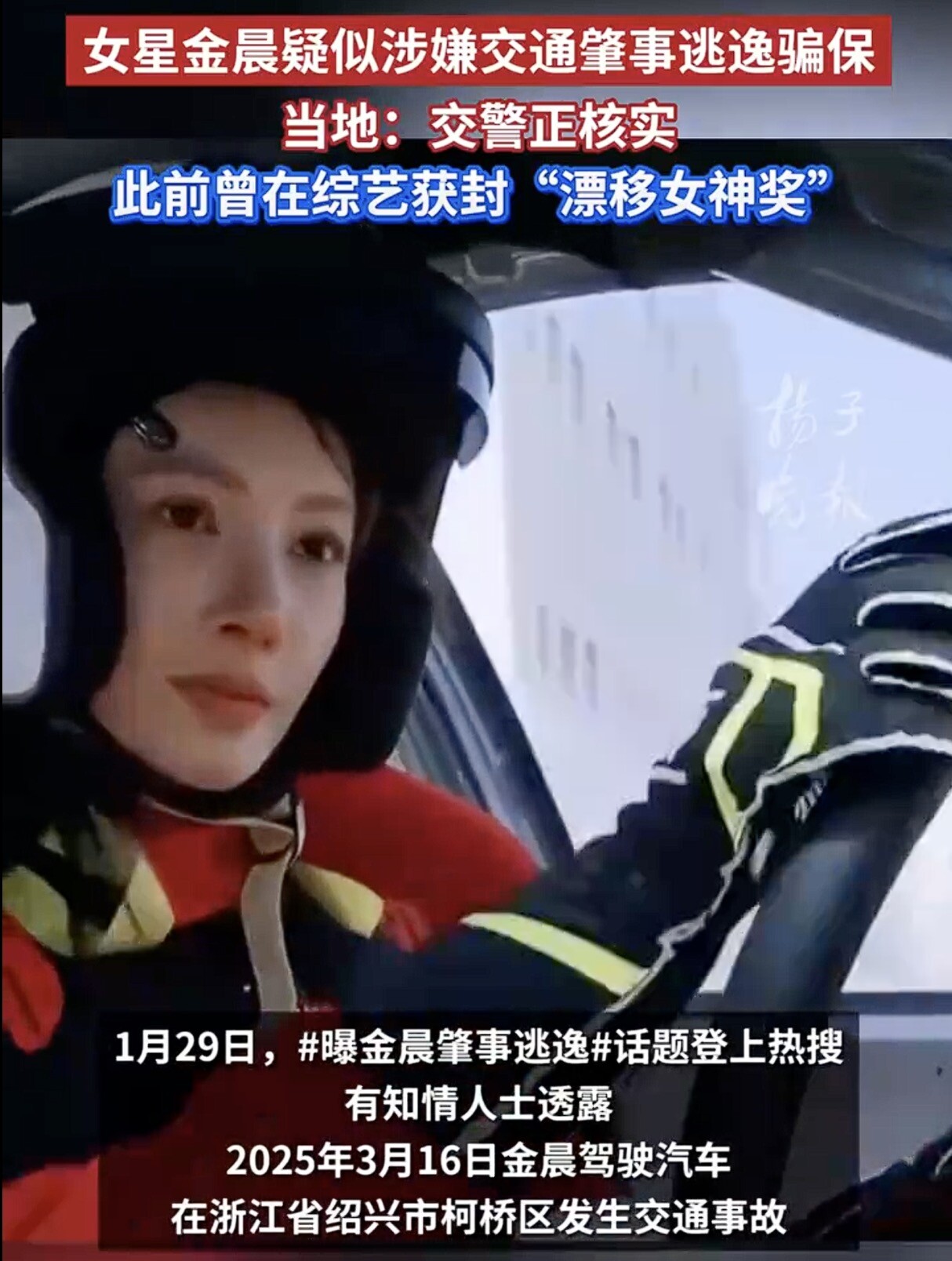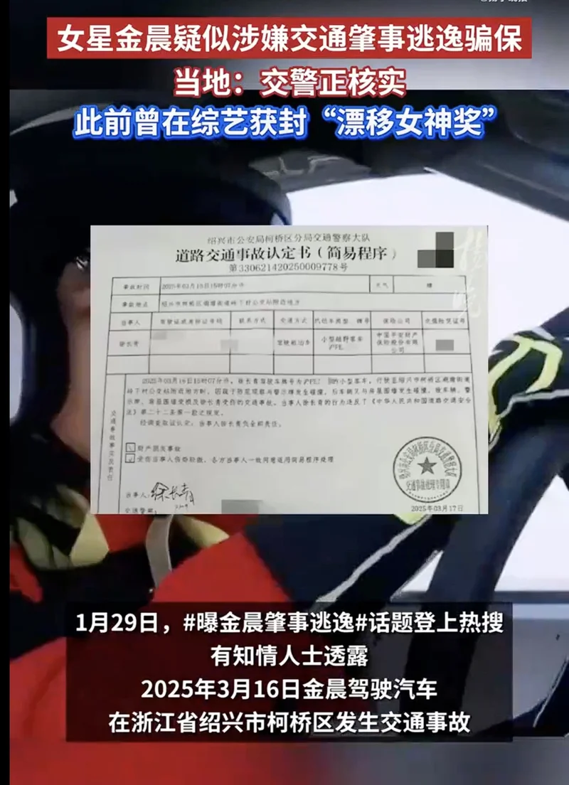 据报道,公开信息称,有知情人士透露,“2025年3月16日金晨驾驶汽车在浙江省绍兴市柯桥区发生交通事故,事故发生后,金晨让自己的助理徐某某顶包,她本人在第一时间逃离事故现场,同时她隐瞒真实情况,涉嫌骗保。”