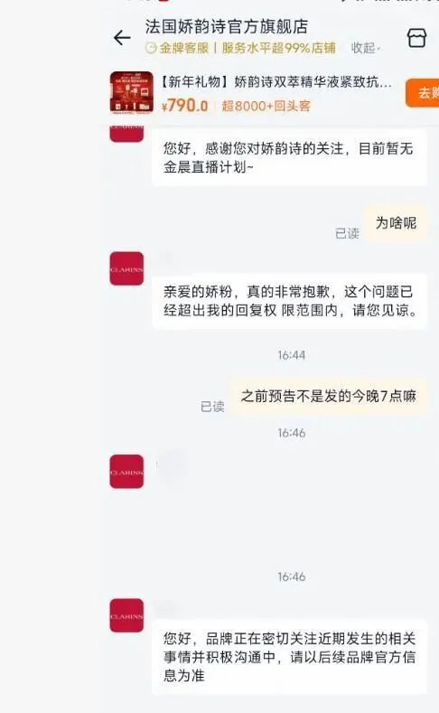 29日下午4时30分许,记者咨询法国娇韵诗官方旗舰店,客服人员回应称:“感谢对娇韵诗的关注,目前暂无金晨直播计划。”记者追问原因,对方回复称:“品牌正在密切关注近期发生的相关事情并积极沟通中,请以后续品牌官方信息为准。”