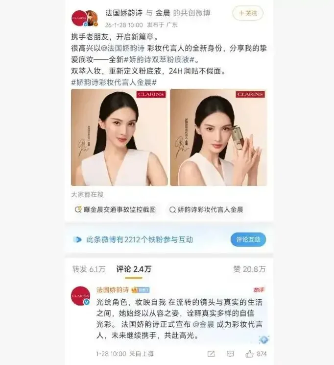 截至记者发稿,娇韵诗官方微博于1月28日发文,宣布金晨成为该品牌彩妆代言人,两者的共创微博仍然在首页置顶。