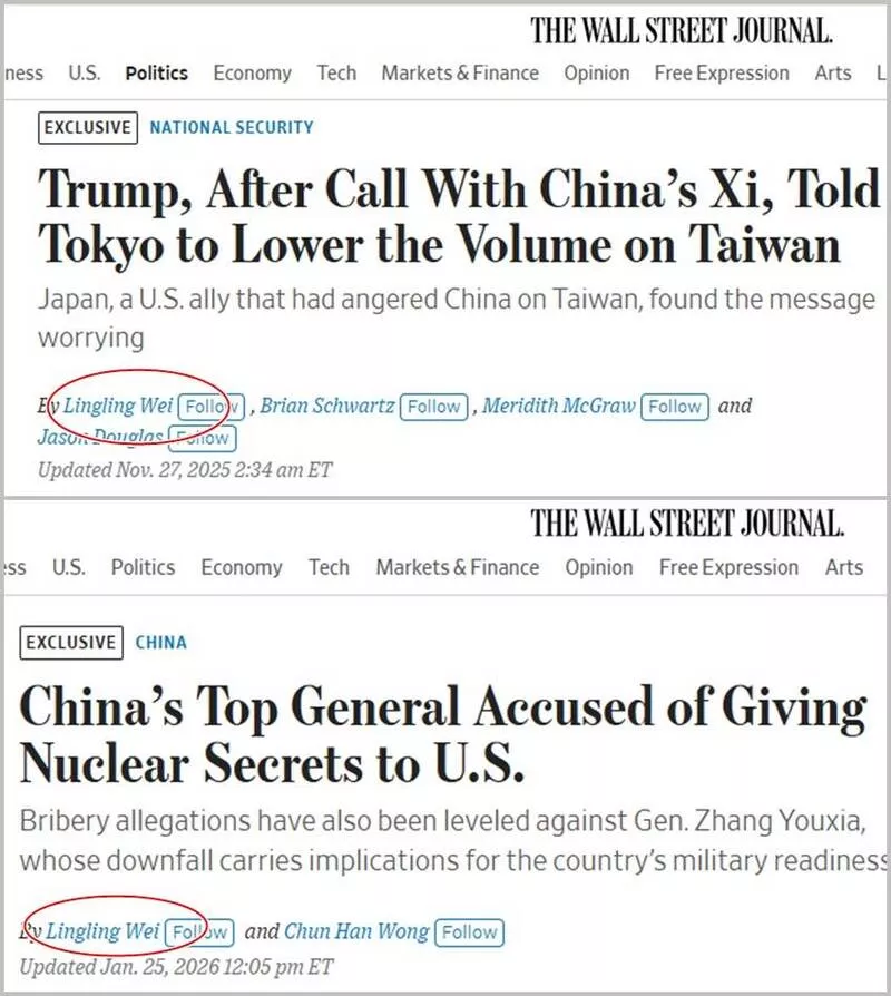 值得一提的是,《WSJ》这篇题为“中国最高军事将领被指控向美国泄露核武机密(China’s Top General Accusedof Giving Nuclear Secrets toU.S.)”的报导,记者就是去年11月27日,撰写“川普与习近平通话后,要求东京在台湾议题收敛一点(Trump, After CallWith China’s Xi, Told Tokyo to Lower the Volume onTaiwan)”的中国裔记者魏玲灵(LinglingWei)。当时中日关系因为高市早苗首相一席“台湾有事”表态急遽恶化,魏玲灵报导称川普致电高市,劝她不要继续在台湾问题上刺激北京,结果遭日本政府直接打脸“并无此事”。