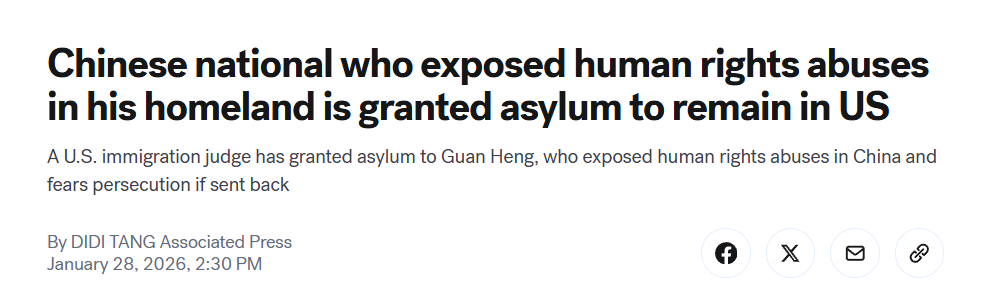 据1月28日报道,一名美国移民法官1月27日周三裁定,批准了一名中国公民的政治庇护申请。法官认定,若其被遣返回中国,将面临“有充分依据的迫害风险”,当事人曾拍摄曝光中国境内的人权问题。