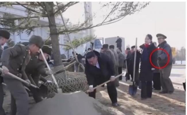 在视频中,金正恩挖土时,金主爱站在他身后,国防相努光铁走过来,轻拍了两下金主爱的背部,做出让她站到前面去的手势。李雪主在后面目不转睛地看着这一幕,随后走近了金主爱。在之后的画面中,金主爱从努光铁的位置移动到金正恩的前面,参与了挖土。