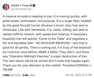 美国总统特朗普(Donald Trump,又译川普)2026年1月28日敦促伊朗回到谈判桌,就核武器问题达成协议,否则美国的下一次攻击将更猛烈。(网页截图)