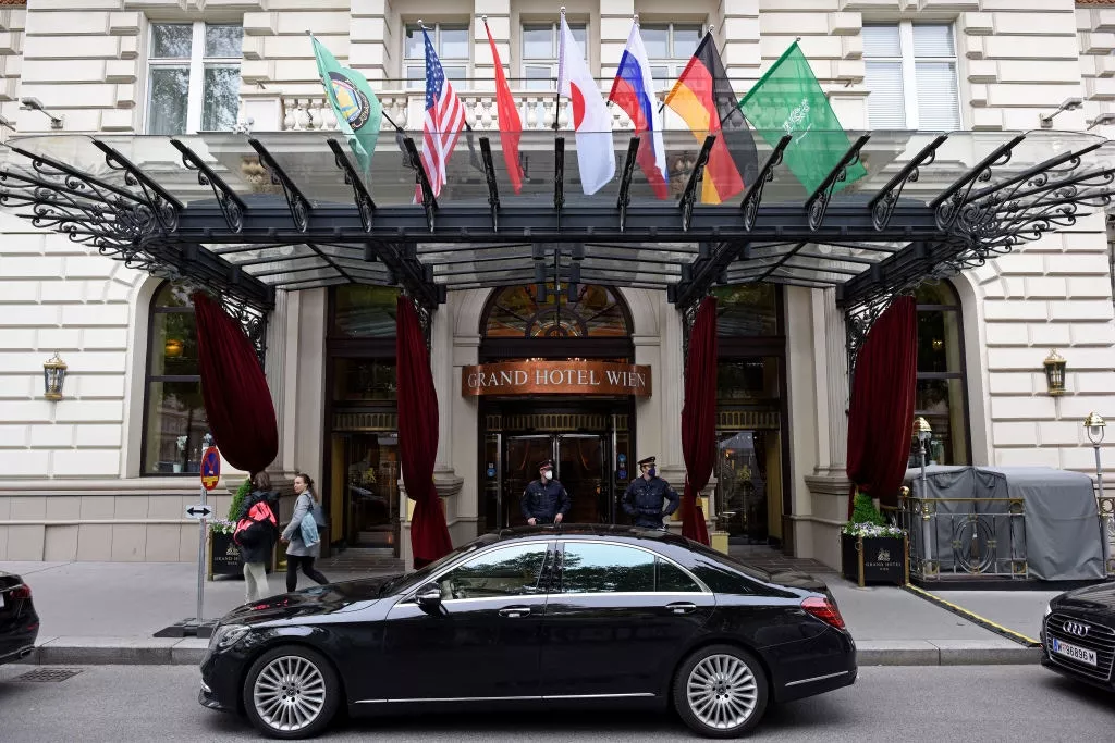 伊朗核谈判:图为2021年,奥地利维也纳举行《联合全面行动计划》(简称:伊朗核协议)伊朗核谈判的酒店门口。(Getty)
