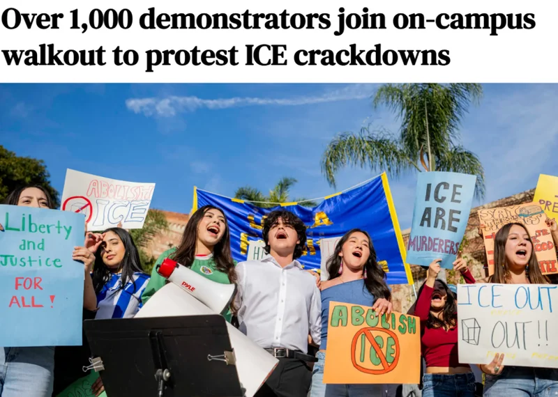 周三(1月28日)下午2点左右,UCLA学生在布鲁因广场(Bruin Plaza)举行演讲集会。随后,发起“集体罢课”,上千名学生在校园内游行示威,反ICE及抗议特朗普政府的大规模驱逐行动。