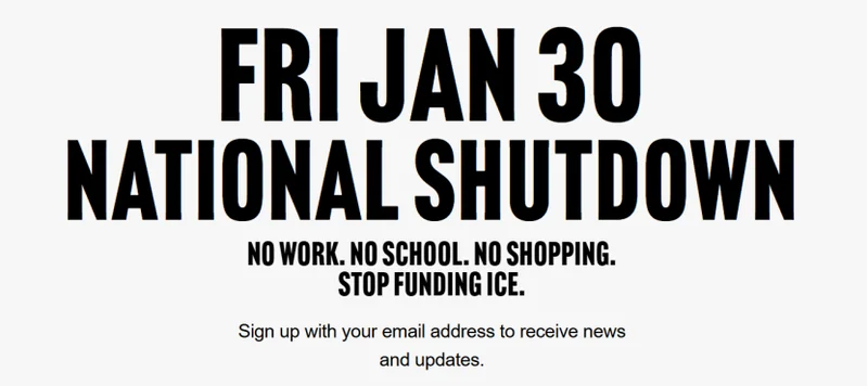 全国停摆运动官网称:“双子城的人民已经为全美树立了榜样——要阻止ICE的恐怖统治,唯一的办法就是让整个系统停摆。”